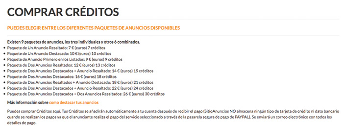 Debajo aparecen los diferentes enlaces (links) de acceso y pago a la pasarela de pago de Paypal de los diferentes paquetes de anuncios disponibles. El link da acceso a Paypal o al pago con tarjeta de crédito a través de la misma pasarela de pago de Paypal (SitioAnuncios.com no almacena ningún tipo de dato del usuario al realizarse los pagos a través de la pasarela de Paypal).