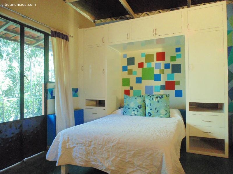 2 Camas matrimoniales, una cocineta ya equipada con utensilios de cocina y vajilla, baño, microondas, plancha independiente, desayunador, y baño completo en la habitación.