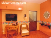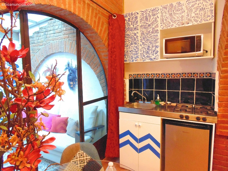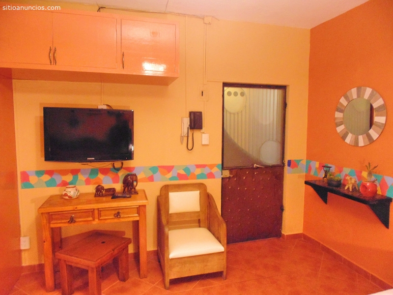 Hospédate en una Suite (Sala amueblada) con una pequeña terraza privada con sillones y una mesa, funcional para para grupos, trabajo, familia; para 4 personas. Cuenta con: 2 Camas matrimoniales, una cocineta ya equipada con utensilios de cocina y vajilla, microondas, plancha independiente, desayunador, y baño completo en la habitación.Todos los servicios básicos ya están incluidos (luz, agua, gas e internet)