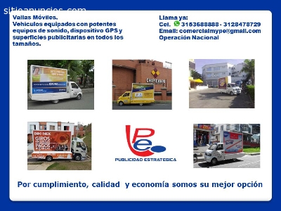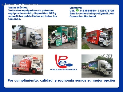 Somos una empresa dedicada al alquiler de todo tipo de carro vallas, vitrinas y oficinas móviles, carros con pantallas led y equipos para eventos, operamos a nivel nacional, Eje cafetero, Valle, Cauca ,Nariño, Antioquia, Costa Atlántica, Bogotá, Santanderes, Llanos orientales Caquetá, Huila y Tolima.Nuestros vehículos son modelos 2014 y 2015, cuentan con homologación del ministerio de transporte para porte de vallas publicitaria, están equipados con sistema de rastreo (GPS), vallas iluminadas con led para mayor visualización en actividades nocturnas y además poseen potentes equipos de sonido de alta fidelidad.