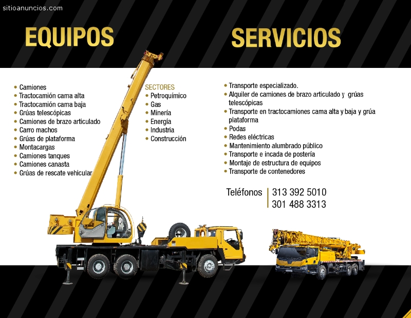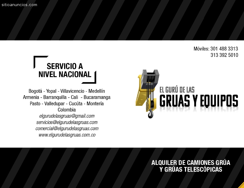 El Gurú de las Grúas y Equipos S.A.S es una empresa reconocida a nivel nacional en los diferentes sectores Industrial, Petrolero, Minero, Energético, de la Construcción y Gas, la cual ofrece todo tipo de soluciones en el alquiler de grúas, equipos y transporte especializado, contando con una gran trayectoria que demuestra la seriedad y el compromiso con nuestros clientes, buscando siempre la satisfacción en los trabajos realizados.Nos podrás ver a través de nuestra página web: www.elgurudelasgruas.com 301 4883313