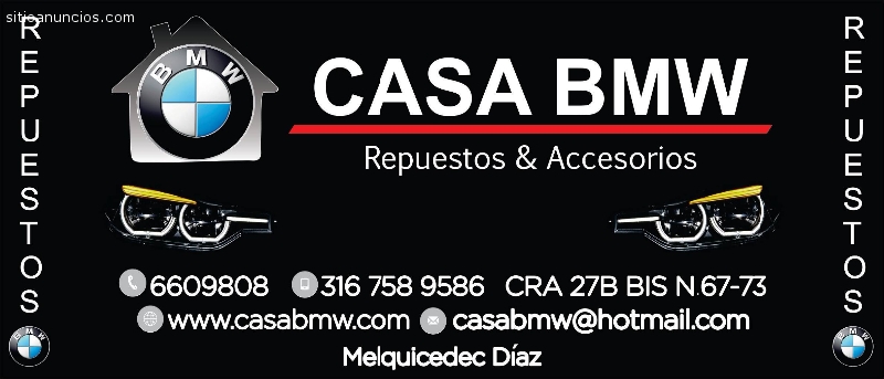 KRA. 27 b bis # 67 - 73. somos un almacén especializado en venta de partes, repuestos y accesorios para bmw nuevos, contamos con más de 7 años de experiencia el mercado, brindando a nuestros clientes calidad y garantía de nuestros productos. Hacemos domicilios y envíos a toda parte del país. Ofrecemos servicio de importación rápida de 8 a 10 días hábiles, recibimos todas las tarjetas, giros y depósitos. Ofrecemos variedad de precios y productos a nuestra distinguida clientela. Visítenos para tener el gusto de atenderlo. comuníquese a nuestra linea: 660 9808 whatsapp: 3167589586 WEB: www.casabmw.com correo: casabmw@hotmail.comPágina web: