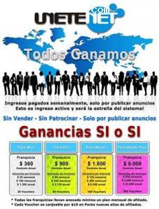 EN UNETENET FRANQUICIAS TE GARANTIZAMOS DESDE 100$ HASTA 2600$ TRABAJANDO DESDE CASA,POR LA PUBLICACION DE ANUNCIOS EN PAGINAS WEB, ENTRE 1 Y 4 ANUNCIOS AL DIA.