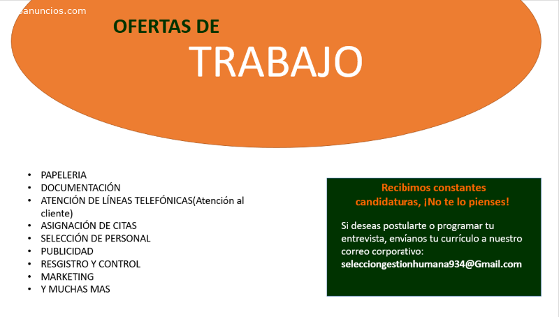 Empresa nacional dedicada al Marketing y Publicidad abre sede en la ciudad de Bogotá, y solicita personal de inmediato para su equipo de trabajo en el área comercial realizando actividades como: Recepción en Atención telefónica y Asignación de citas, supervisión de personal, manejo de datos y organización, entre otras actividades propias de la compañía. Personas interesadas en la oferta enviar su hoja de vida a nuestro correo corporativo: (selecciongestionhumana934@g mail. com) con el fin de gestionar de manera oportuna el proceso de contratación Importante, para esta oferta no se requiere de experiencia, disponibilidad de inmediata de bachilleres o estudiantes de Lunes a Viernes (medio tiempo), posibilidad de teletrabajo.Página web: