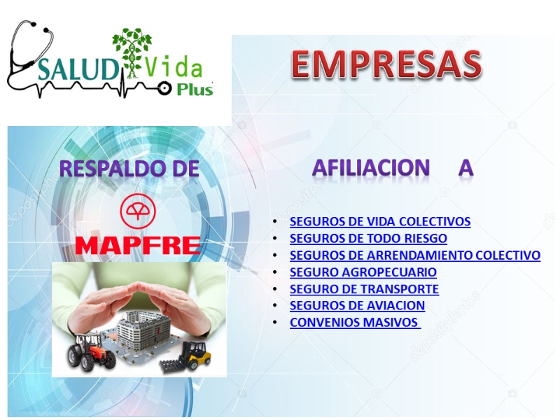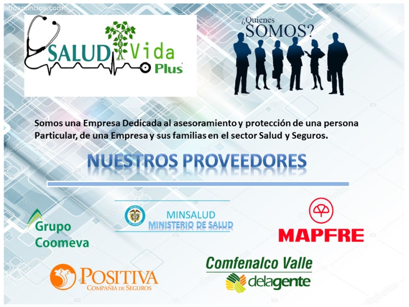 Salud y vida plus es una Empresa dedicada a la afiliacion de Seguridad Social y Seguros en Colombia, su sede Principal e en la Ciudad de Cali – Valle del Cauca, Realizamos Afiliacion EPS (Salud) – Afiliacion ARL (Riesgos Profesionales) - Afiliacion a AFP (Fondo de Pensiones) – Afiliacion a CCF (Caja de compensación familiar) , Somos una Empresa sin Animo de Lucro, Que Brinda Una asesoría Especializada en el Tema de La Salud, Realizamos Afiliacion a Medicina Prepagada y Afiliacion a los diferentes Seguros como Seguros de Vida, Seguros Educativos, Seguros Exequiales, Seguros de Educación, Seguros de Arrendamiento, Seguros de Responsabilidad Civil, y Seguros de Automóviles como SOAT y Seguro Todo Riesgo… Tenemos Convenio con las Entidades de Grupo Coomeva y Mapfre seguros, Compañías la cuPágina web: