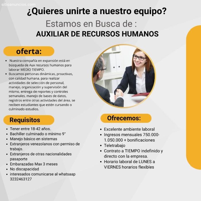 Nuestra compañía en expansión está en búsqueda de Aux recursos humanos para laborar MEDIO TIEMPO.Buscamos personas dinámicas, proactivas, con calidad humana, para realizar actividades de selección de personal, manejo, organización y supervisión del mismo, entrega de reportes y controles semanales, manejo de bases de datos, registros entre otras actividades del área. se reciben estudiantes que estén cursando o culminado estudios.