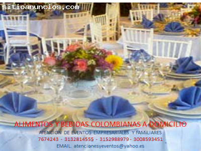 Organización y atención de eventos empresariales y familiares, servicio de meseros y chefs a domicilio, alquiler de todo tipo de menaje para sus actividades sociales, conductor elegido a toda hora, organización y desarrollo profesional de eventos en general, decoración, música, bufetes, servicio al cliente.Desayunos empresariales, almuerzos y cenas tipo bufete, paellas, asados, picadas, tablas de quesos, ceviches, lechonas, refrigerios, pasa-bocas, cocteles, vinos, catas de vinos y cursos, licores, cervezas.