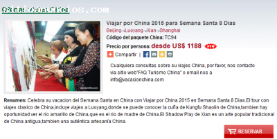 Celebra su vacacion del Semana Santa en China con Viajar por China 2015 en Semana Santa 8 Dias.El tour con viajes clasico de China,incluye viajes a Luoyang,donde se puede conocer la cuña de Kungfu Shaolin de China,tambien hay oportunidad ver el rio amarillo de China,que es el rio de madre de China.El Shadow Play de Xian es un arte popular tradicional de China antigua,tambien una auténtica artesanía China.Página web: