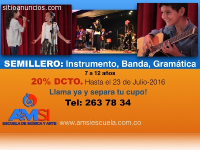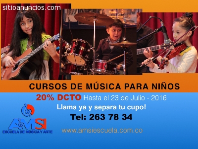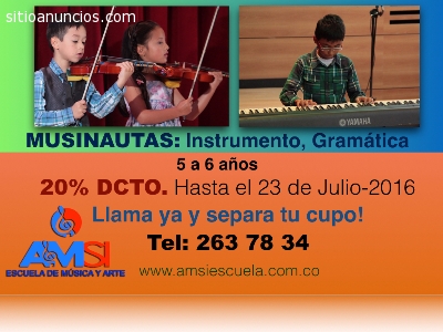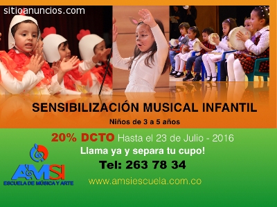 Tenemos una excelente opción para que los niños y niñas inicien en el mundo de la música y los sonidos, a partir del reconocimiento auditivo de sonidos de la ciudad, la casa, el campo y finalmente contenidos musicales, potencializamos el desarrollo cog-nitivo del niño y favorecemos su capacidad idiomática.Nuestro programa de sensibilización musical, trabaja actividades de: ritmo, motricidad fina y gruesa, memoria musical, desarrollo auditivo, seguimiento de instrucciones.