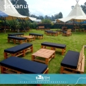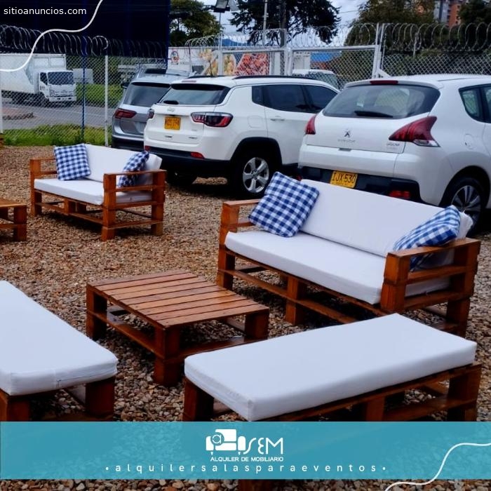 Alquiler de Sala en Estibas con Cojines Blanco y Negro¡Transforma tu espacio con nuestra exclusiva Sala en estibas, fusionando lo rústico y lo elegante! Perfecta para eventos íntimos o grandes celebraciones, nuestras salas están disponibles para 6, 8 y 10 personas, ofreciendo comodidad y estilo en cada detalle.