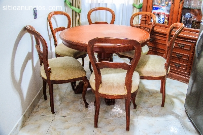 Vendo hermoso juego de sala y comedor seis puestos en madera súper económico. El comedor es de seis puestos. Armario de comedor. La sala cuenta con un sofa dos sillones y dos mesas auxiliares.Información