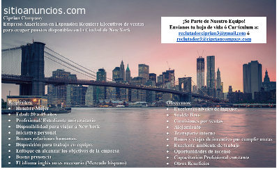 Hombre/Mujer, Edad: 20 a 45 años, Profesional/ Estudiante universitario, Disponibilidad para viajar a New York (poseer visa), Iniciativa personal, Buenas relaciones humanas, Disposición para trabajo en equipo, Enfoque en alcanzar los objetivos de la empresa, Buena presencia, El idioma inglés no es necesario (Mercado hispano)