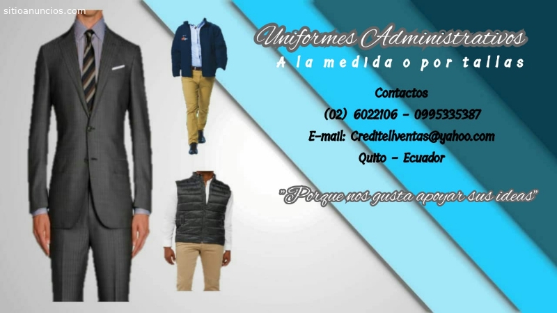 CREDITELL… Empresa dedicada a la confección de UNIFORMES EJECUTIVOS, OPERATIVOS Y A LA DOTACION DE IMPLEMENTOS DE SEGURIDAD INDUSTRIAL …ofrece Chaquetas, chalecos, pantalones, corbatas, camisas, blusas, ZAPATOS, CARTERAS y OTROS como camisetas tipo polo, chompas, gorras, jeans, mandiles, overoles y cualquier prenda adicional bajo pedido, las prendas pueden ser bordadas y/o estampadas según requerimiento del cliente….ATENDEMOS A NIVEL NACIONAL