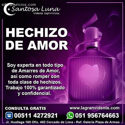 Soy Santosa Luna, experta en todo tipo de Amarres de Amor, así como romper con toda clase de hechizos, mi trabajo es 100% garantizado y confidencial. Retorno del ser amado en 3 noches de luna llena, canalizo tus sentimientos para devolverte al hombre o mujer humillado y rogando por tu amor.Jr. Huallaga 160 Of. 402 Cercado de Lima (Galería Plaza de Armas)