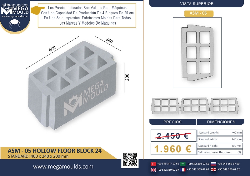 NUESTROS MOLDES SON FABRICADOS CON ACERO ESPECIAL DE CALIDAD ST 52-A1.LOS PRECIOS ESPECIFICADOS SON VÁLIDOS PARA MÁQUINAS QUE PRODUCEN 4 BLOQUES DE 20 CM EN UNA SOLA IMPRESIÓN. FABRICAMOS MOLDES PARA TODAS LAS MARCAS Y MODELOS DE MÁQUINAS. PARA TODAS SUS NECESIDADES DE MOLDES DE DIFERENTES CAPACIDADES, POR FAVOR CONTACTE CON NOSOTROS Y SOLICITE UNA OFERTA.