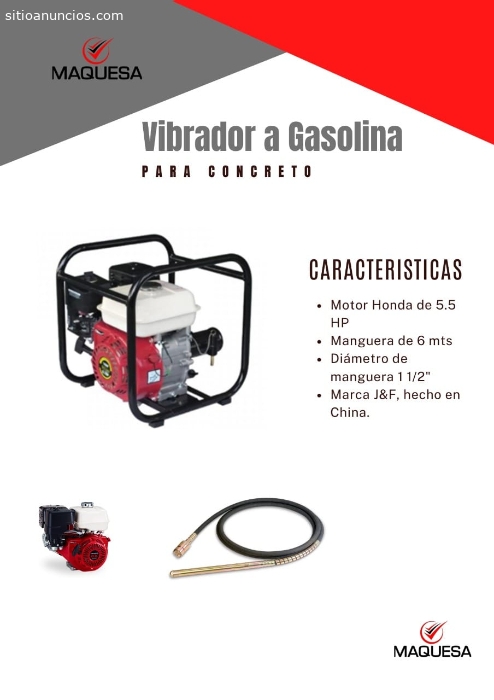 Vibrador de concreto a gasolina JF HONDA GX160. Herramienta de Calidad. Acoplado a Motor HONDA GX160 de 5.5 hp. Con manguera de transmisión de 1.5 Pulg. (38 mm) de diametro, por 7 metros de largo. Hecho en China, esta es una maquina herramienta de alta calidad y eficiencia al eliminar las burbujas de aire al concreto. Inversión US$ 646.00 Iva incluido. Inf. Cell. 7555-8227Información