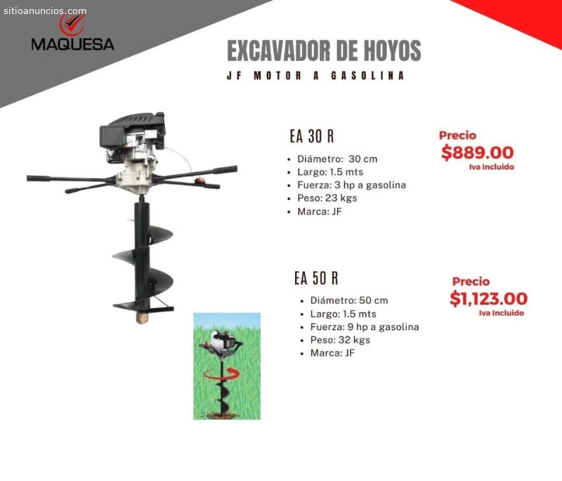 Excabadores de hoyos Profesionales, JF China 3hp y 9 hp, Excelente y útil maquina para la industria de la construcción y agricola. Cón motor 3 hp. a gasolina, 4 tiempos (no mezcla) Agujero de 30 cms. Largo 1.5 mts. US$ 889.00. Cón motor de 9 hp. Agujero de 50 cms. Largo $ 1,123.00 excelentes maquinas a un excelentes precios. Invierte en calidad y y alto rendimiento. Inf. Cell. 7555-8227.Información