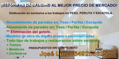 Se ofrece yesista / escayolista con más de 25 años de experiencia en el sector para realizar todo tipo de obras y reformas en yeso, escayola, perlita… en Málaga y provincia.Se realiza todo tipo de trabajos como: