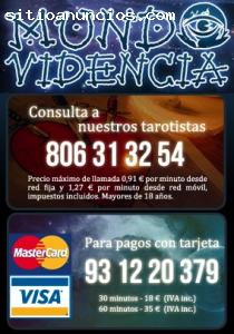 Mundo Videncia pone a tu disposición sus líneas de Tarot 806 y Tarot VISA, para que nos consultes acerca de las dudas que te mantienen intranquilo. Si te sientes confuso y no sabes qué rumbo tomar estás en el lugar adecuando. Conseguiremos desbloquear las energías que te mantienen paralizado.806313254: Precio máximo de llamada 0,91 € por minuto desde red fija y 1,27 € por minuto desde red móvil, impuestos incluidos.