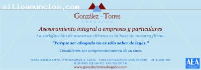 GONZALEZ TORRES ABOGADOS SLDespacho Abogados Lawyers Advocats Rechtsanwälte especializado en una atención jurídica integral a empresas, autónomos, y particulares en las islas canarias, en derecho penal, defensa y acusación particular, juicios de faltas, juicios rápidos, Juicios con Jurado, delitos económicos, accidentes de trafico, atropellos de personas y ciclistas, accidentes aéreos, reclamación de daños materiales y personales, y derecho procesal.