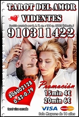 TAROT VISA CERRADA /TAROT DEL AMOR /VIDENCIA 910311422 VISA desde 4€ 15 min/ 6€ 20min/ 8€ 30min//10€ 40min /15€ 55min / 17€ 70min/ 20€ 90min...806002128 desde Coste min. 0, 42/0, 79 cm € min red fija/móvil. Soy vidente profesional Fechas. Te garantizo una consulta de alta calidad, déjame decirte lo que vendrá a tu vida, con tan solo oír tu voz Alta experiencia en tarot del amor , de Pareja , Amistad , también en temas Laborales, Familiares, Económicos… videntes psíquicas expertas Servicio prestado por S.A.V. ap. c 164 cp. 46002 Valencia. Solo mayores de 18 años. Llamada a teléfono sin coste adicional. Visa 910 311 422 / 806 002 128 desde Coste min. 0, 42/0, 79 cm € min red fija/móvil. Videncia, Tarot, Tirada del Amor, rituales, péndulo, Numerología, Runas, sueños.