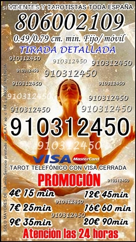 TAROT RESPUESTAS ACERTADAS VIDENTE REAL DIRECTA 910312450visa desde desde 4 € 15 min/ 7 € 25min/ 9€ 35min. / 12€ 45min . 17€ 70.MIN 20€ 90min QUIERES CAMBIOS Y RESPUESTAS VIDENTE DIRECTA 910312450 La llamada se corta sola al terminar el tiempo contratado/ ofertas en visa /master card Precios con impuestos Incluido. 806 002 109 desde Coste min. 0,42/0,79 cm € min red fija/móvil. Solo mayores de 18 años. Servicio prestado por K.A.V. ap. c 164 cp. 46002 Valencia. Atención las 24 horas. Rituales