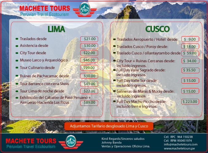 Traslados, Hoteles, Tours, ingresos, aéreos internos, disfrute su viaje, nosotros nos encargamos de todo a un precio increíble.