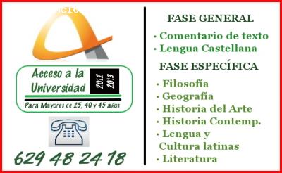 Licenciada en Filosofía y Letras, en activo, imparte clases para el Acceso a la Universidad para Mayores de 25 y de 45 años.Las pruebas constan de una Fase General compuesta de Comentario de Texto y Lengua Castellana para ambos grupos. Los mayores de 25 años también tendrán que elegir una opción de exámenes mientras que los mayores de 45 años sólo tendrán que superar esas pruebas y pasar una entrevista.