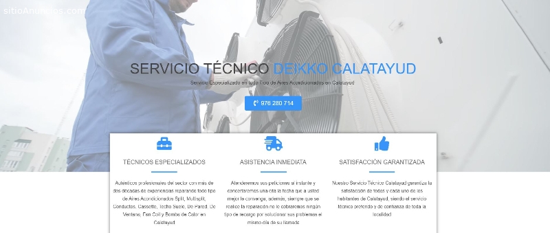 Visite nuestra web: Servicio Técnico Deikko CalatayudCuando su aparato de Aire Acondicionado Deikko le cause problemas es importante que contacte con un Servicio Técnico Deikko profesional como nuestro Servicio Técnico Deikko Calatayud, pues contamos con una amplia red de técnicos a su completa disposición conocedores de todo tipo de averías que puedan tener sus aparatos de aire acondicionado, pues cargan con una experiencia de más de 25 años en todas sus reparaciones, además, trabajamos con piezas de recambio originales de la marca Deikko para garantizar un funcionamiento óptimo de su aparato de climatización del hogar, prestamos servicio a todo tipo de aparatos de aire acondicionado del tipo Split, Cassette, Conductos y Bomba de calor, por ello somos conocidos como un Servicio Técnico