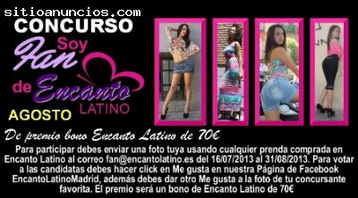 Hasta el 31 de Agosto puedes participar en el concurso "Soy Fan de Encanto Latino" para concursar sólo tienes que enviarnos una foto tuya utilizando cualquier prenda o accesorio comprada en nuestra tienda, el premio será un bono de 70€ y tu foto luciendo el premio en nuestra página web. La ganadora será la foto que más me gusta reciba en nuestro facebook ¡Participa y día a tus amigos que te voten!Recuerda que Encanto Latino www.encantolatino.es la mejor tienda online que te permite comprar lo último de la moda latina (Ropa colombiana y brasilera) desde la comodidad de tu hogar, en este sitio encontrarás lo más variado y las últimas colecciones en: