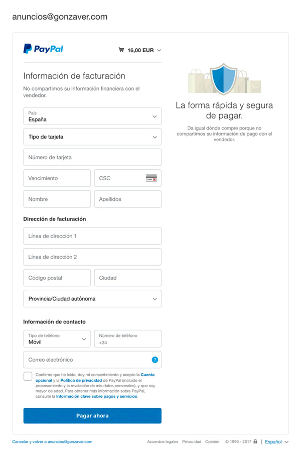 Una vez que pinchas sobre el paquete de anuncios que te ha interesado, tienes que completar tu perfil de usuario con algunos datos para formalizar el pago