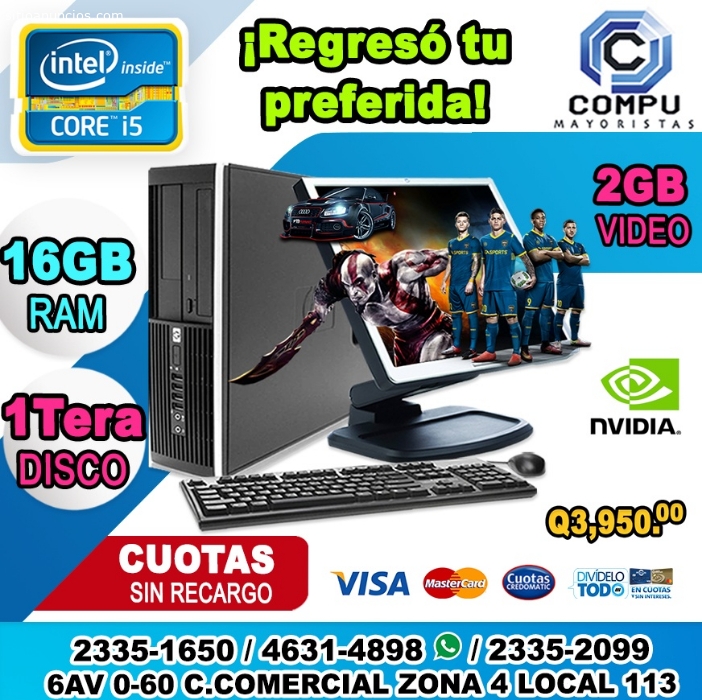 POTENTES COMPUTADORAS HP COREi5, 16GB RAM, 1TERA DISCO DURO, 02GB DE VIDEO, LCD 22P A Q 3,950.00, Llevatelas en Visa Cuotas o bien Cuotas Credomatic, de Q 359.00 TEL: 2335-2099//5701-6630 (WHATSAPP) Ven por la Tuya,, Gran Centro Comercial Zona 4 Local 113, Primer Nivel... Tel: 2335-2099//5701-6630Página web: