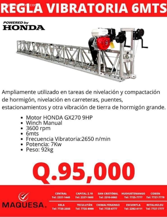 En Maquesa contamos con reglas vibratorias de gran potencia para carreteras ,bodegas y calles internas con módulos de colado de concreto de hasta 6 mts entre juntasREGLA VIBRATORIA MARSHALLTOWN