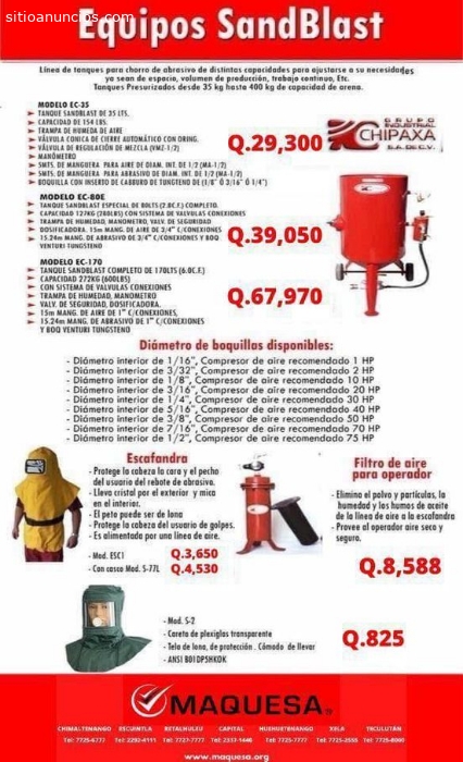 Equipo de sand blasting para la limpieza y preparación de superficies a ser revestidas. Se utiliza aire comprimido para propulsar partículas abrasivas a altas velocidades sobre una superficie revestida o no revestida. Mientras que el arenado abrasivo es tecnológicamente sencillo, el convertir de manera segura una mezcla de partículas abrasivas y aire comprimido en un tratamiento efectivo, requiere planificación y preparación así como herramientas y equipos diseñados de acuerdo a solidos princip