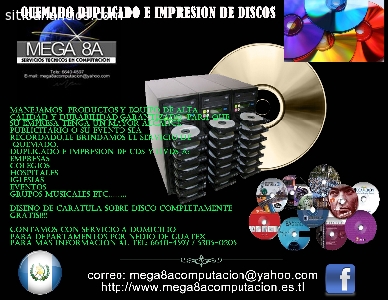 Quemado Duplicado impresion de discos CD y DVD MANEJAMOS PRODUCTOS Y EQUIPO DE ALTA CALIDAD Y DURABILIDAD GARANTIZADO, PARA QUE SU EMPRESA TENGA UN MAYOR ALCANCE PUBLICITARIO O SU EVENTO SEA RECORDADO,LE BRINDAMOS EL SERVICIO DE QUEMADO, DUPLICADO E IMPRESION DE CDS Y DVDS A: EMPRESAS COLEGIOS HOSPITALES IGLESIAS EVENTOS GRUPOS MUSICALES ETC.......... DISEÑO DE CARATULA SOBRE DISCO COMPLETAMENTE GRATIS!!!! CONTAMOS CON SERVICIO A DOMICILIO PARA DEPARTAMENTOS POR NEDIO DE GUATEX para mas informaPágina web: