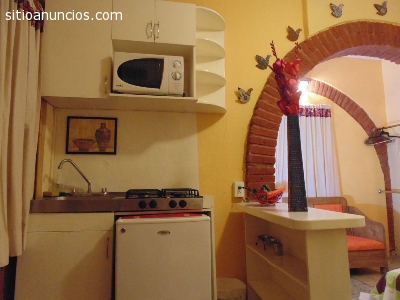 Amueblado con cama matrimonial, sofá y cocineta que tiene todos los utensilios necesarios para preparar alimentos.