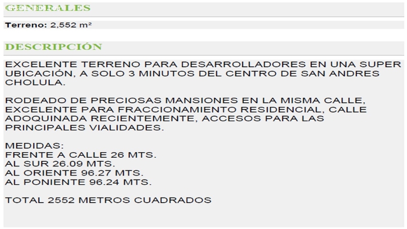 Venta de terreno cerca de la UDLAP en Cholula, Pue son 2,552 m2 a solo $3,500 m2 todos los servicios es propiedad y tiene calle pavimentada