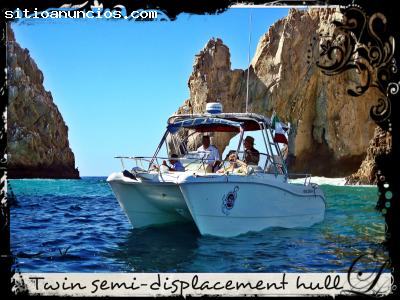 Vive una aventura ejemplar con comodidad y seguridad abordo de nuestro catamarán a motor. Un barco lo suficientemente serio para pescar, lo suficientemente placentero para navegar y todo por una buena razón; su doble semi-desplazamiento del casco el cual fue diseñado para surcar las olas en lugar de sentir el embate de ellas, lo que le da rapidez a una travesía excepcionalmente suave.Nuestra embarcación encantara a cada miembro de su grupo ya que ofrece todas las ventajas de un casco de catamarán a motor, además de que tiene un diseño con servicios adaptados a favor de las familias que disfrutan tanto de la pesca deportiva así como de excursiones relajantes; esto a partir desde su zona de asientos acolchonados en forma de U en la proa, donde ofrece un lugar cómodo para pasar el rato, hasta su amplio compartimento adjunto con WC en el interior.