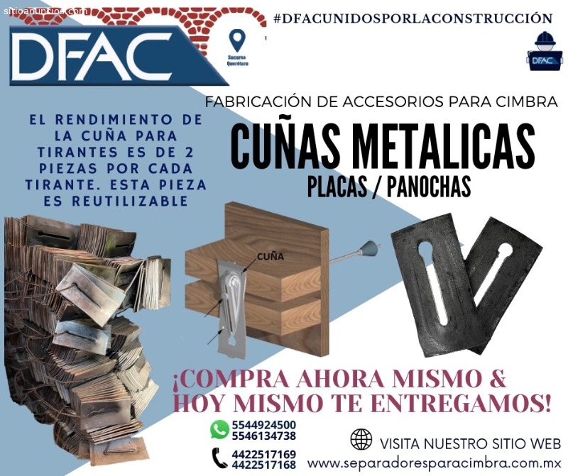 EN DFAC QUERÉTARO LÍDER EN ACCESORIOS PARA CIMBRA ofrece moños y cuñas para cimbra para el acabado aparente.Somos Fabricantes de Moños y Cuñas para Cimbra. Los tenemos en todas las medidas que requiera desde 10 cm. hasta 2 metros trabajamos medidas especiales asi como tambien con rondana de neopreno. Tenemos la cuña estándar fabricada con placa de acero 3/16" al alto carbon.