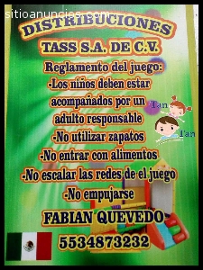 Alberca de pelotas, Tirolesa, Figuras en lona, Barril, Pelota, y Disco colgante, Resbaladillas con barandal de esponja