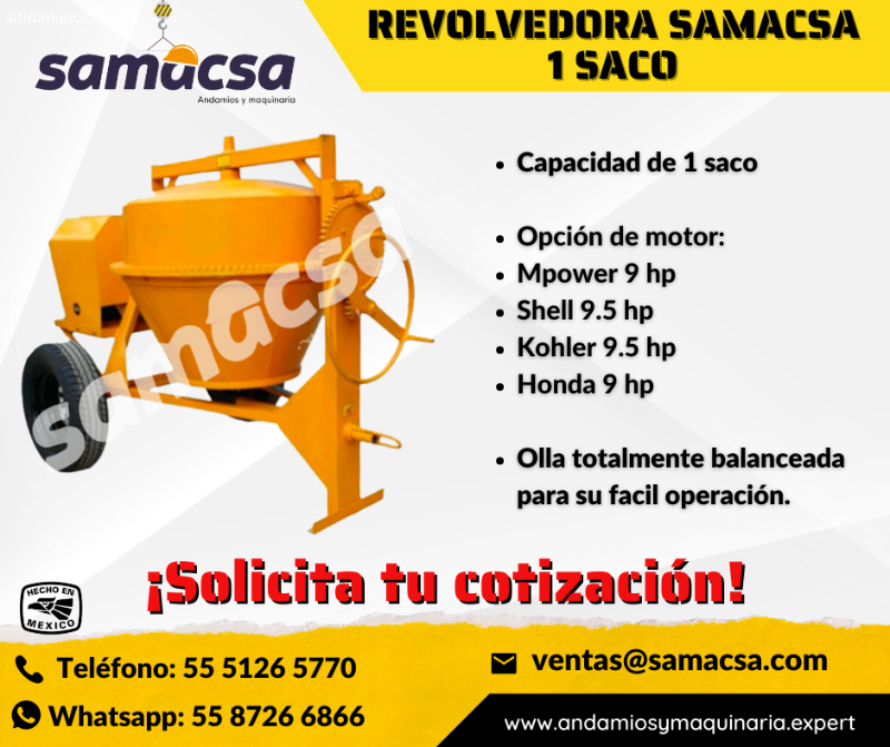 Fácil de limpiar y anticorrosivas, fabricadas para ser de un uso mas sencillo y fácil de cargar y descargarContamos con Revolvedoras de concreto de varias capacidades de 1 Saco, 1 ¼ Saco, 1 ½ Saco Y 2 Sacos con base de motor que acepta distintos tipos de motores propios para revolvedoras a gasolina o revolvedoras eléctricas y revolvedoras de mortero ideales para la mezcla de mortero, yeso y texturizados.