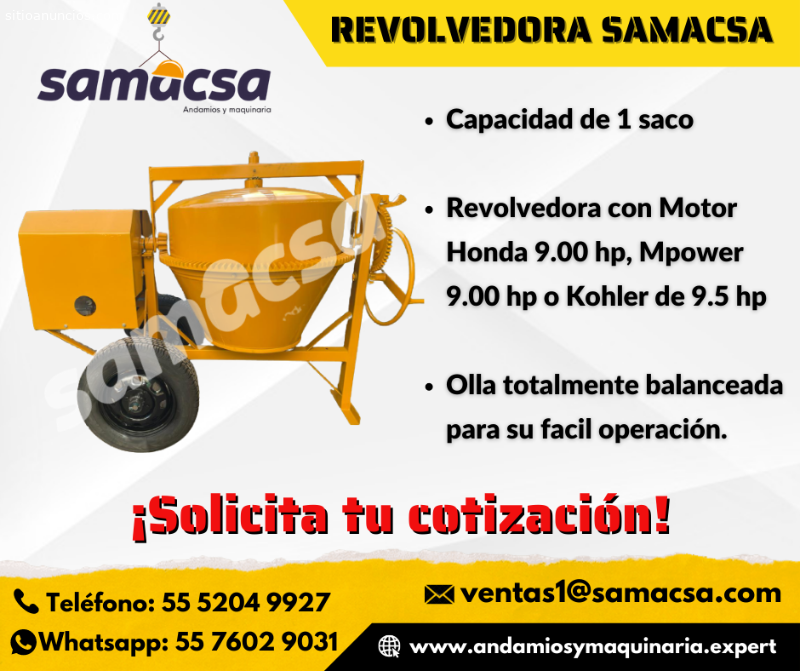 Revolvedora 1 saco Samacsa•La principal función de las revolvedoras es mezclar el cemento con agua, arena y/o grava con el fin de formar el concreto de forma homogénea, este equipo permite a la gente hacer su trabajo mucho más fácil. Las revolvedoras cuentan con una olla perfectamente balanceada, son totalmente resistentes debido a que están hechas con el mejor acero, más fáciles de limpiar, anticorrosivas, silenciosas y de mayor duración además de ser fabricadas para un fácil manejo de carga
