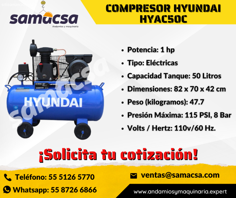 Compresor marca HYUNDAI con potencia de 2 hp. Ideales para sopletear, pintar, barnizar, uso en talleres y vulcanizadoras.Ideal para los diferentes usos que se le den, esta compresora de aire es capaz de ejercer la presión necesaria sin falla