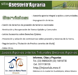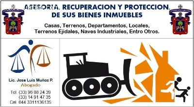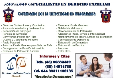 Somos un despacho de abogados de alto valor añadido, con experiencia acreditada de más de 10 años en todas las ramas del Derecho, que ofrece a sus clientes una importante colaboración en el logro de sus objetivos y en la resolución de sus problemas. Contamos con un amplio número de abogados que permite ofrecer un servicio multidisciplinar con un alto nivel de especialización. Atención jurídica integral a empresas, personal autónomo y particulares. Nuestro ámbito de actuación se extiende a nivel nacional, nos encontramos en la ciudad de Guadalajara, Jalisco, Pida Información sin compromiso. http://mjoseluis.mex.tlÁreas de Trabajo: Familiar, Penal, Agrario, Mercantil, Arrendamientos, Desahucios, Amparos Penales y de todas las áreas legales.