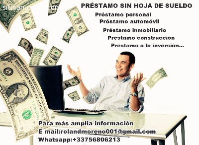 Con nuestro préstamo personal, concretadas sus proyectos sin justificantes de utilización y sin Hoja de sueldo: Préstamo automóvil, préstamo inmobiliario, margen de crédito, préstamo personal, préstamo construcción, préstamo a la inversión… Y aprovechadas de un acompañamiento personalizadoPara más amplia información