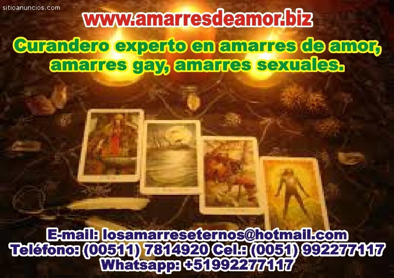 Curandero experto en trabajo de brujería y curanderismo pone a su disposición todos sus conocimientos en soluciones de amarres de amor, maleficios en su contra, enfermedades sin cura, rituales de amantes, uno y desuno parejas, doy vuelta toda clase de Magia Negra que impida tu felicidad.Soy descendiente de uno de los líderes Brujos de las Huaringas más conocidos en el mundo y heredero de un poder superior a muchos otros Chamanes. Mantengo todos mis trabajos bajo estricto secreto.