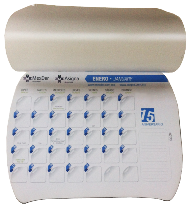 TEL.: 55 81 16 63 81 LOS MOUSE PAD AGENDA O CALENDARIO LLEVAN IMPRESIÓN DE 12 HOJAS A 4 X 0 TINTAS (SELECCIÓN DE COLOR AL FRENTE), SOBRE PAPEL COUCHÉ MATE DE 150 GRS. UNA CARA.LOS MOUSE PAD AGENDA LOS FABRICAMOS CON CUBIERTA DE LEXAN. LAS HOJAS VAN ENCUADERNADAS EN LA CABEZA. INCLUYE SUAJE CON ESQUINAS REDONDEADAS