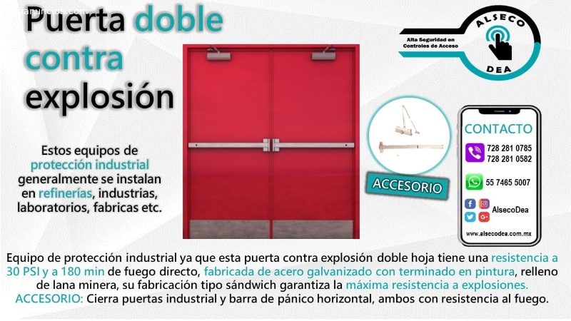 Estos equipos de protección industrial generalmente se instalan en refinerías, industrias, laboratorios, fabricas etc.Equipo de protección industrial ya que esta puerta contra explosión doble hoja tiene una resistencia a 30 PSI y a 180 min de fuego directo, fabricada de acero galvanizado con terminado en pintura, relleno de lana minera, su fabricación tipo sándwich garantiza la máxima resistencia a explosiones.