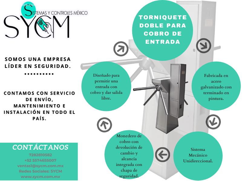 “SISTEMAS Y CONTROLES MÉXICO”Los torniquetes de control de acceso son ideales para lugares públicos o privados y dónde se desee restringir el acceso a los usuarios a un área específica mediante la identificación de diferentes tipos de lectura y dónde el espacio con el qué se cuenta es reducido.