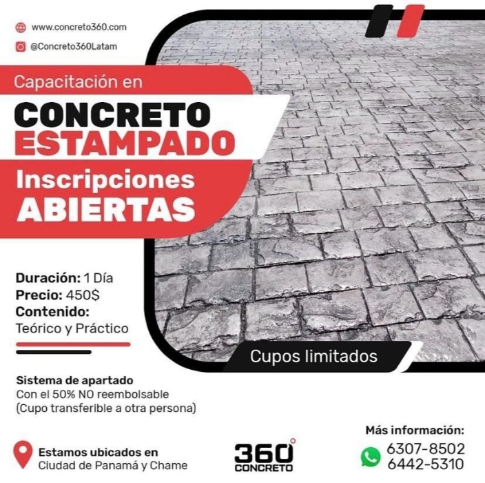 ¡Capacita a tu equipo con los mejores en Concreto Estampado! ?¿Eres emprendedor, contratista o parte de una gran empresa constructora o promotora en busca de formación especializada para tu personal? En Concreto 360, te ofrecemos capacitaciones de élite en la técnica de concreto estampado, diseñadas para transformar tus proyectos y elevar la calidad de tus servicios. Como pioneros en la producción de materiales y aplicación de concreto estampado en Panamá, garantizamos una formación integral